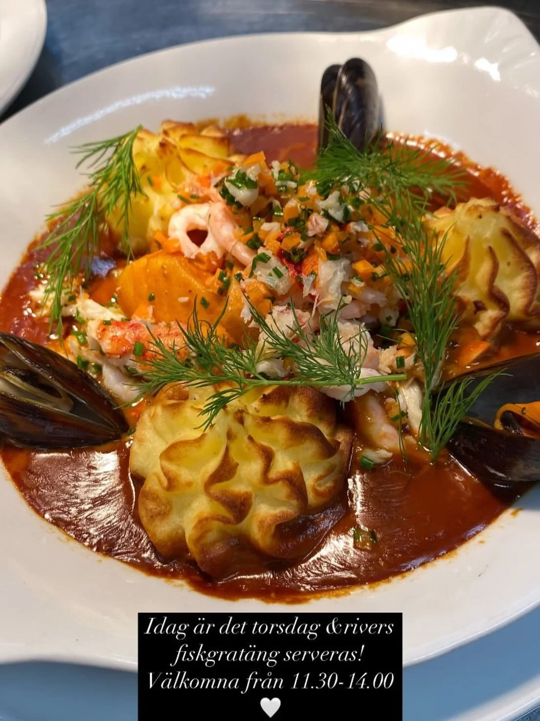 ….Rivers fisk och skaldjurssoppa med gratinerat vitlöksbröd, syrad fänkål och dillsallad inkl. thoureau stilla och kolsyrat vatten samt vår konditorsval av dessert tillsammans med kaffe 425:- ..River’s fish and shellfish soup with au gratin garlic bread, pickled fennel and dill salad incl. thoureau still and carbonated water plus our pastry chef’s choice of dessert together with coffe 425: -….